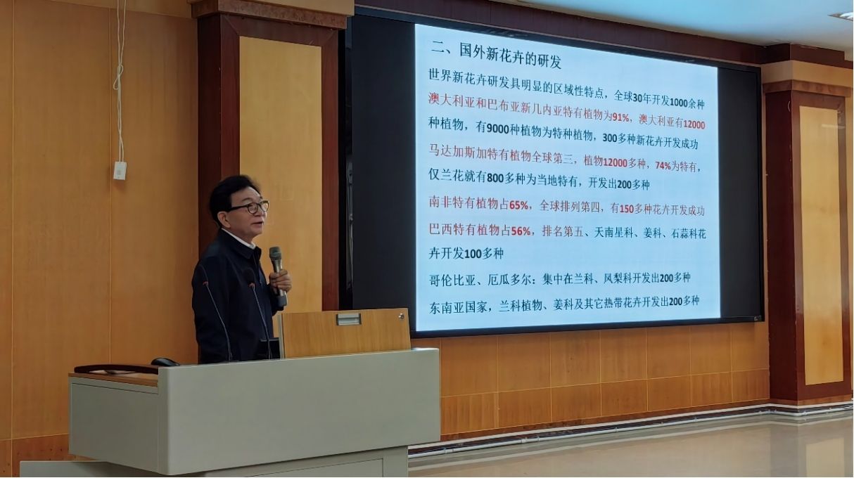 中国园艺学会观赏园艺专业委员会秘书长、国家花卉工程技术研究中心执行主任程堂仁教授级高级工程师,开展了题为《花卉产业形势与新质生产力培育》的学术报告。程老师在报告中分析了花卉产业发展的五个阶段所面临的形势与挑战,指出未来我们的创新发展目标是新质生产力培育与高质量发展。他认为,随着市场竞争的加剧和消费者需求的多样化,花卉产业需要不断创新和升级,提高产品质量和附加值,做出特色的工作。此外,重点强调了科技在花卉产业中的引领作用,提出了加强科技创新、培养高素质人才和推动产学研合作的建议。