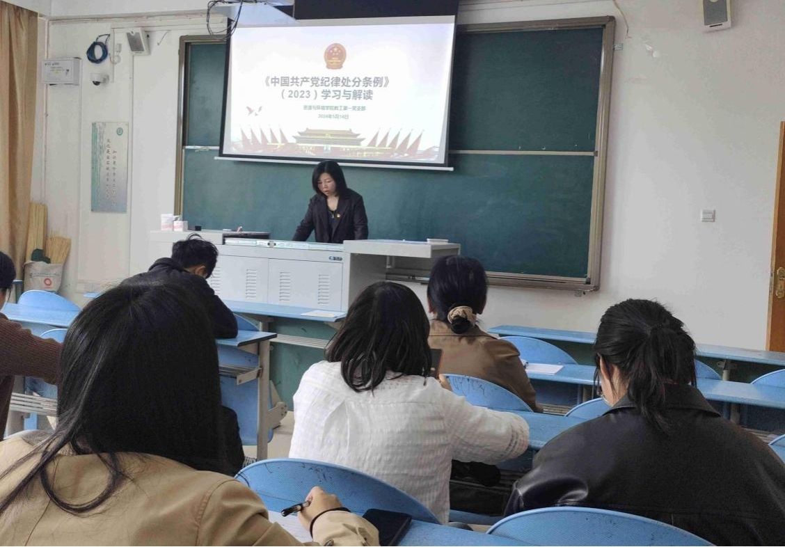 4月19日下午,资源与环境学院教工第一党支部根据“资源与环境学院开展党纪学习教育计划”安排,开展《中国共产党纪律处分条例》(2023)(以下简称《条例》)集中学习并研讨。