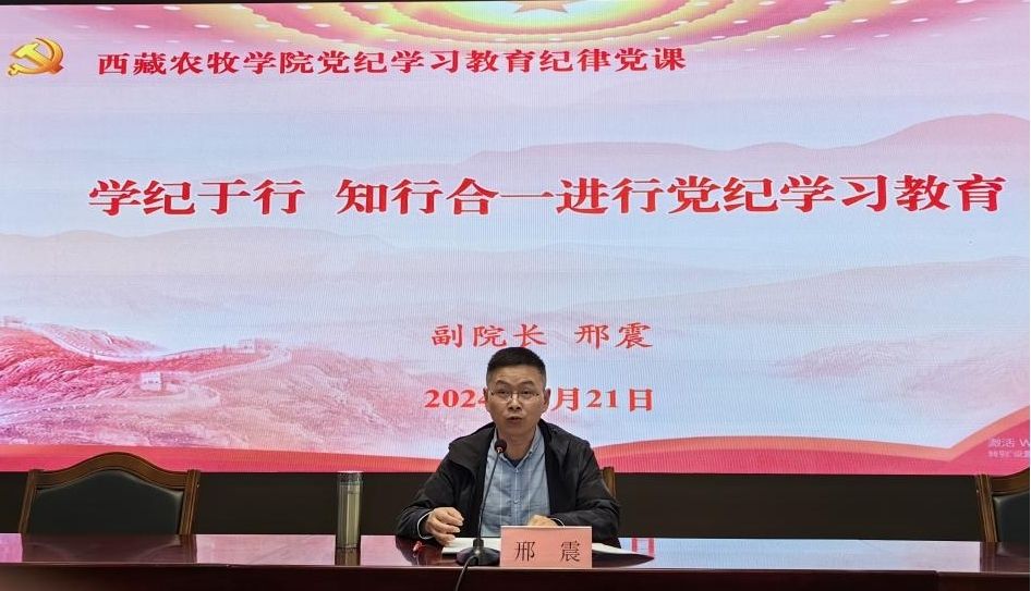 为深入学习贯彻《中共中央办公厅关于在全党开展党纪学习教育的通知》精神,根据学校关于开展党纪学习教育的工作方案部署。2024年6月21日下午,学校党委委员副院长邢震讲党纪学习教育专题党课,教务处直属党支部、研究生处直属党支部、科研处直属党支部、成人教育部党总支、高原生态研究所党总支以及资源与环境学院的全体教职工党员及学生党员代表参加本次专题党课。
