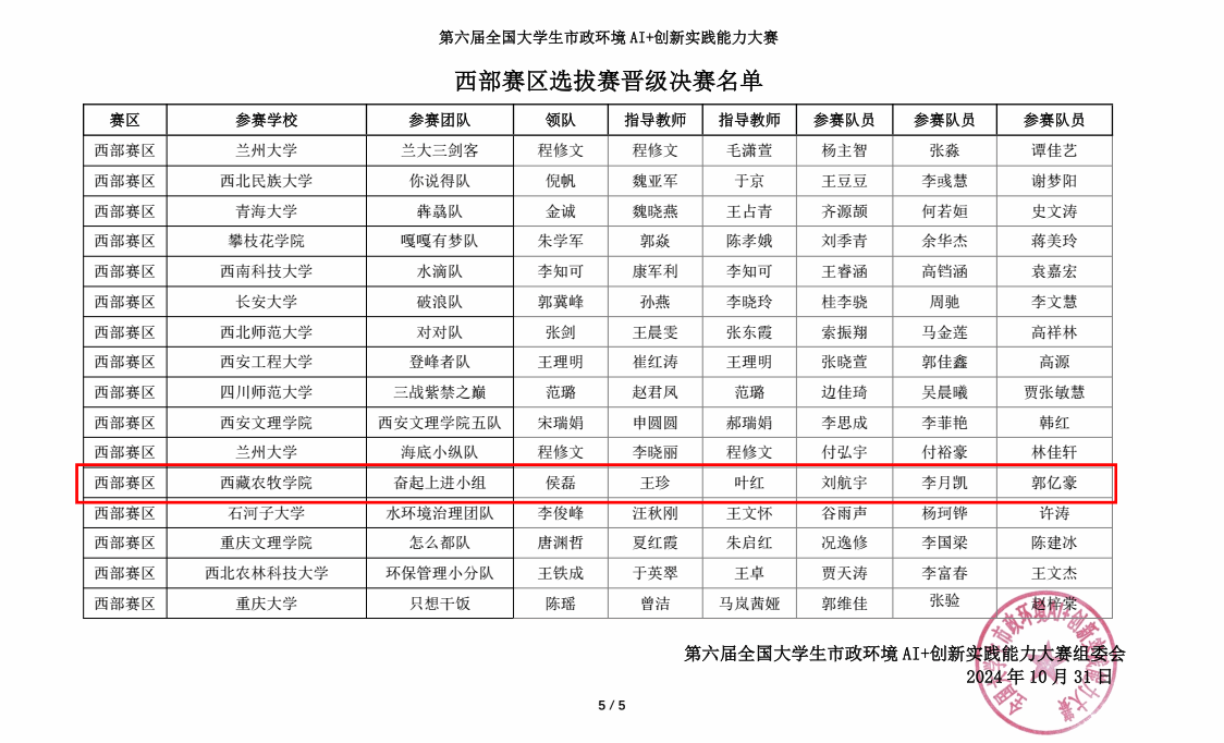为落实立德树人根本任务,发挥智慧教育新优势,把创新教育贯穿教育活动全过程,推进学科交叉融合,打造环境学科复合型人才,培育新质生产力发展新动能,为教育强国建设支撑引领中国式现代化作出更大贡献,由哈尔滨工业大学、同济大学、北控水务集团有限公司等共同主办了第六届全国大学生市政环境AI+创新实践能力大赛。大赛分为校级预选赛、地区选拔赛和决赛。资源与环境学院薛会英教授作为顾问、侯磊副教授作为总领队联系相关专业本科生参加。通过各参赛学院教师有序组织与指导,按赛程要求共预选出包括环境科学、环境工程、应用化学、食品科学等专业在内的15名学生共5支队伍参加地区选拔赛。近期,地区选拔赛结果公布。化验赛方面,王珍、叶红老师指导的参赛选手刘航宇获得西部赛区一等奖,李月凯、郭亿豪获得二等奖;罗珊、于宝政老师指导的参赛选手韩明洋、孔芳莹分别获得二等奖、三等奖;韩兴昊、侯磊老师指导的参赛选手郑凤、秦宗闰获得三等奖;张英、饶月老师指导的参赛选手李骅谱获得三等奖。虚拟仿真赛方面,王珍、叶红老师指导的参赛选手李月凯、郭亿豪、刘航宇分别获得西部赛区二等奖、三等奖、三等奖,张英、饶月老师指导的参赛选手李骅谱、龙漪婷分别获得二等奖、三等奖,罗珊、于宝政老师指导的参赛选手孔芳莹、韩明洋获得三等奖,韩兴昊、侯磊老师指导的参赛选手秦宗闰、姚人元获得三等奖。此外,王珍、叶红老师指导的“奋起上进小组(刘航宇、李月凯、郭亿豪)”晋级决赛。