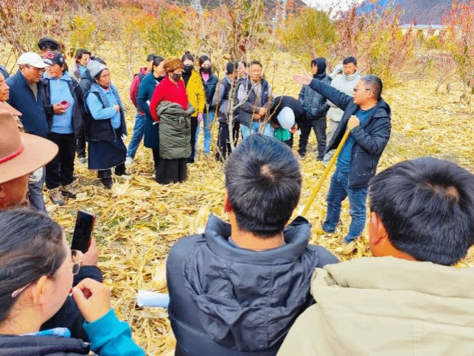 培训会上,大布穷老师首先围绕经济林育苗对农牧民进行培训,帮助学员更好的了解耕地深度、时间季节及工序,细心为农牧民讲解了如何选种育种,回答了学员如何让施肥、何时施肥的疑问,提升农牧民高效种植等方面专业能力。德庆措姆老师为农牧民讲解如何管理果树肥水,培训会上德庆措姆老师对果园状况进行分析,根据不同树的生长发育情况给出了合理的管理方式供农牧民学习参考。最后叶彦辉老师就地取材在现场为农牧民们示范果树的修建整形,示范不同树种的修建方式,讲解不同时期不同果树的修建方式,以互动问答等形式帮助学员快速打开思路,加深对培训知识的理解。