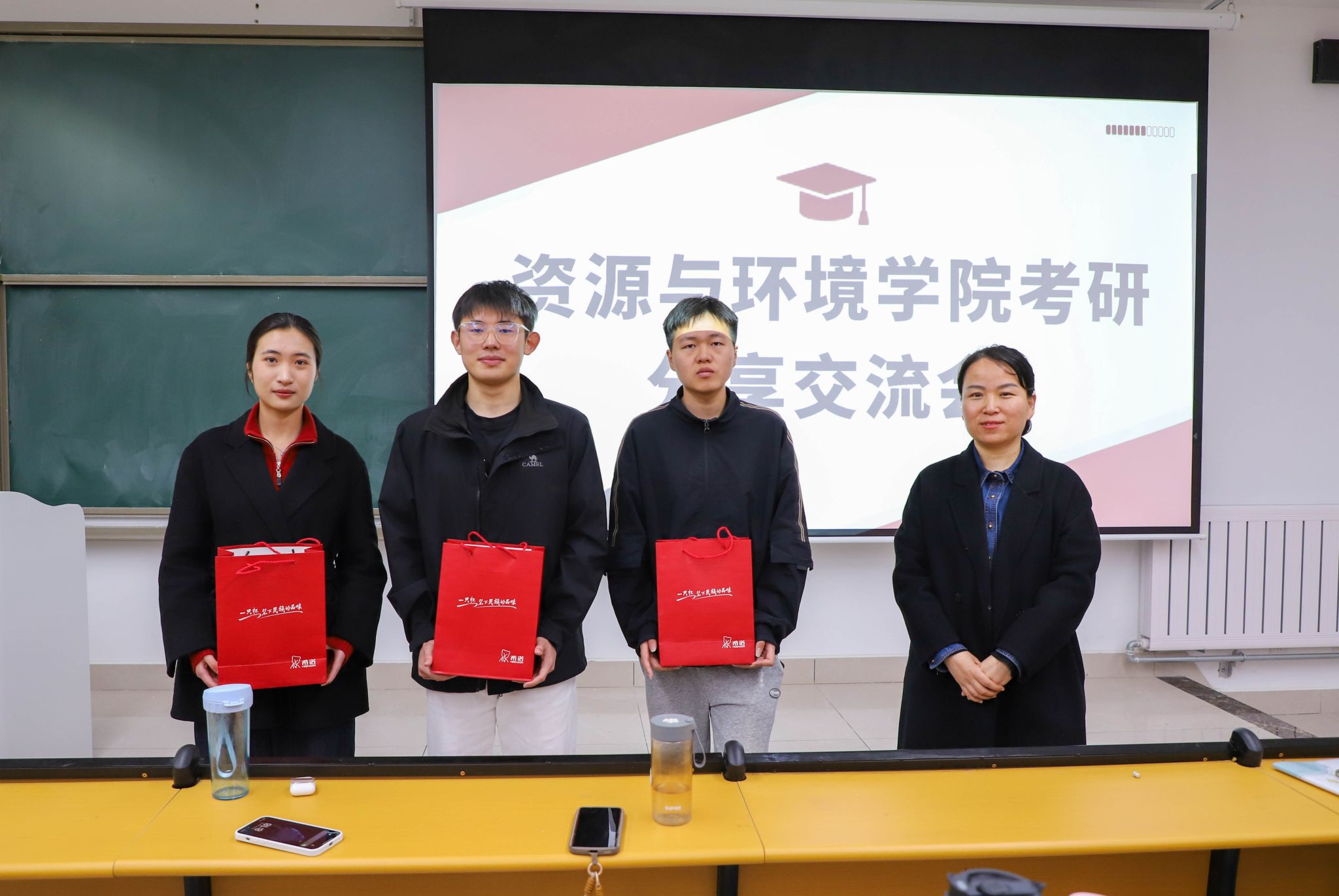 交流会上,考取中国农业大学的朱永利同学强调,备考需精准对标目标院校的招生特点,建议结合个人兴趣、学科优势及院校招生数据综合考量,采取循序渐进的复习策略,注重夯实基础知识,避免盲目突击。考取东北林业大学的孙婕妤同学围绕学习资源获取方式,向同学们推荐了主流考研平台、专业课程资料及高效学习工具,并分享“分阶段复习法”,鼓励同学们树立自信,持续发力。考取厦门大学的卢关正,针对复试流程、面试礼仪及常见问题应答策略进行详细讲解,提出同学们在备考期间缓解压力的方法,鼓励同学们保持积极乐观的心态,坚定考研信念。答疑环节,同学们围绕“跨专业考研难度”、“时间规划”、“调剂流程”等热点问题踊跃提问,三位同学结合自身备考经历逐一解答,现场氛围热烈。交流会最后,郭洋老师对本次交流会进行总结,感谢三位同学的倾囊相授,肯定了经验分享的实用性与针对性。她鼓励在场同学以优秀学长学姐为榜样,合理规划备考路径,保持恒心与毅力,并向三位优秀学生赠送学院准备的小礼品。