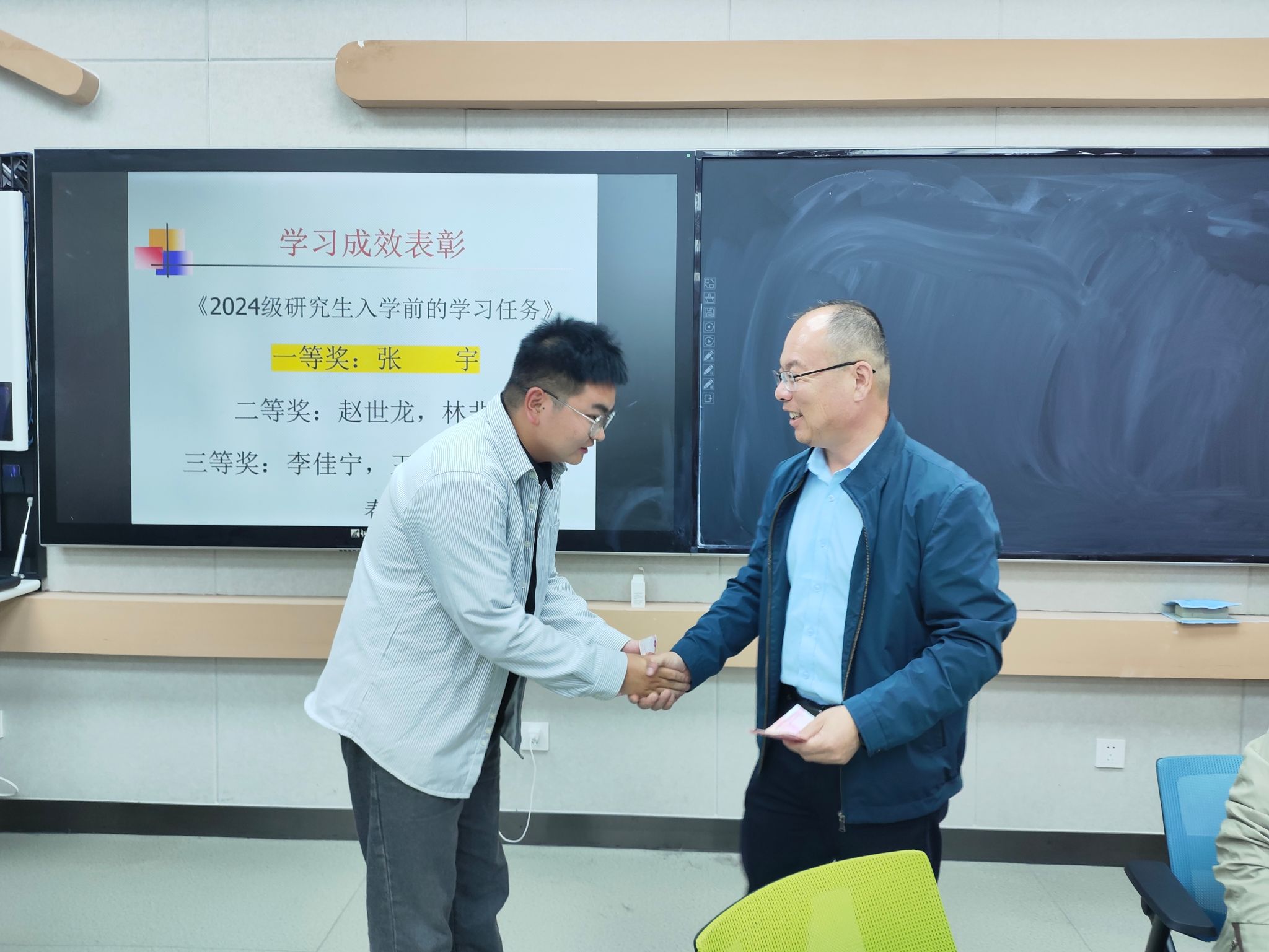 会议伊始,刘天平教授对全体研究生新生的到来表示热烈的欢迎!然后对《研究生入学前的学习任务》的完成情况进行了点评,忧喜参半。接着,学硕负责人宋连久对《学习任务》完成优秀的前6名学生进行了奖励,分别是一等奖1人(张宇),奖励300元/人;二等奖2人(赵世龙、林非凡),奖励200元/人;三等奖3人(李佳宁、王茜、周小春),奖励100元/人;同时每人奖励笔记本和笔。
