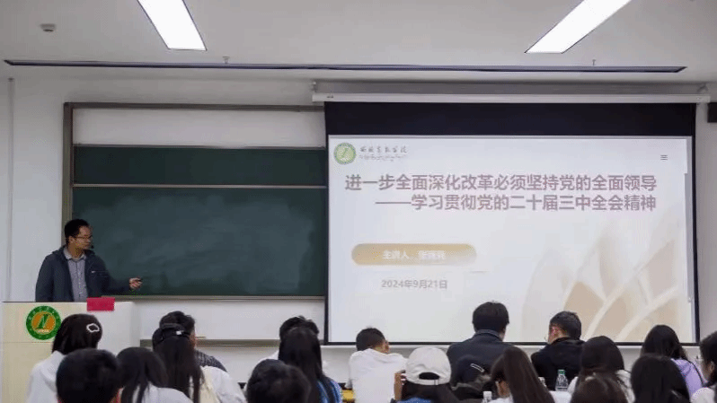 为全面深入学习领会党的二十届三中全会精神,营造奋进新征程的良好氛围,进一步发挥基层党组织的战斗堡垒作用,2024年9月25日晚上,植科学院学生党支部在6203教室举办了学习党的二十届三中全会精神的主题党课,特邀了校宣传部张克克老师为大家讲党课,学院学生党支部全体党员及积极分子60余人参加了此次活动。