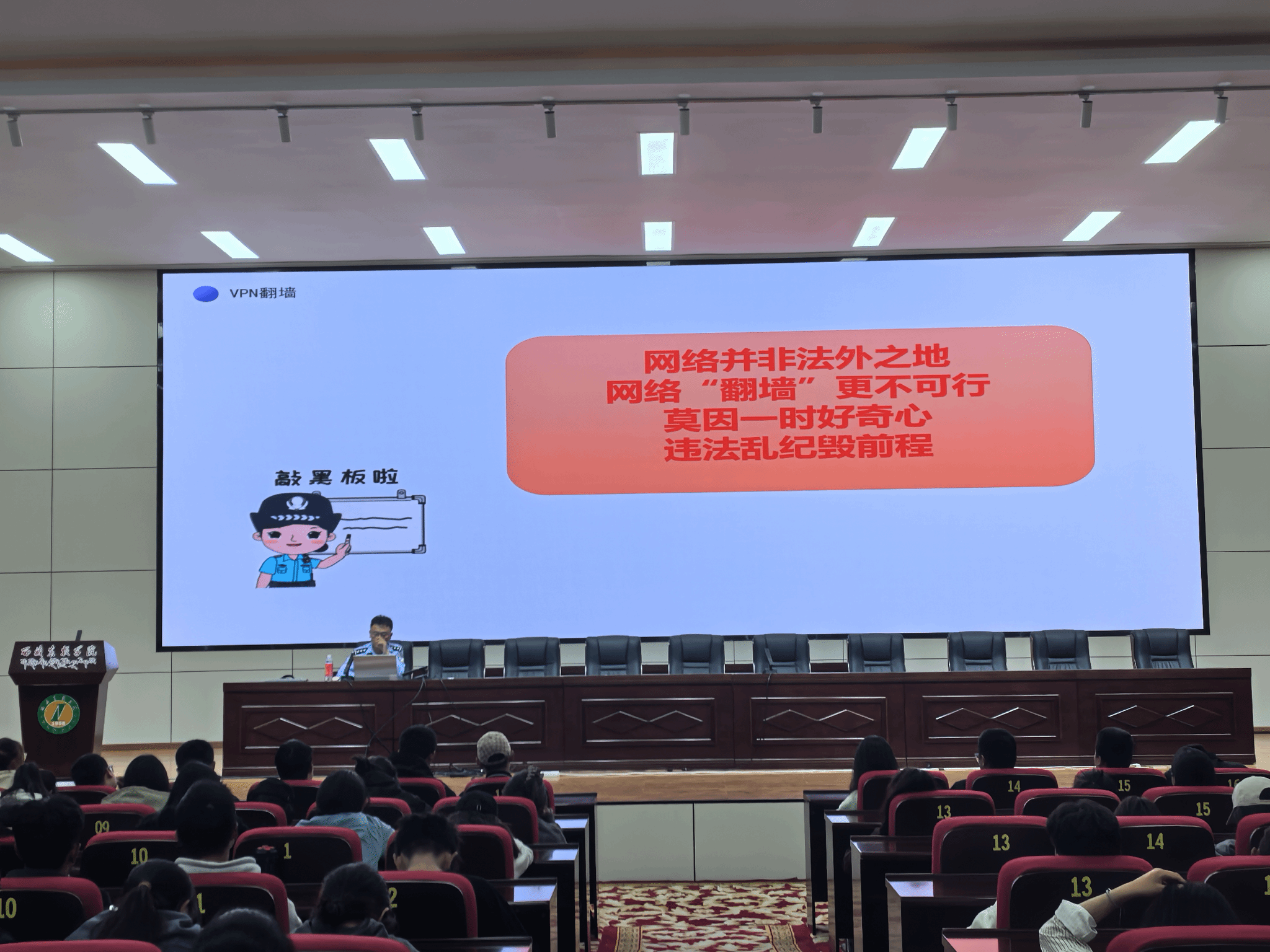 为创建平安校园,加强校园网络安全,进一步深化拓展2024级新生入学教育和党风廉政宣传教育月活动,不断增强大学生网络安全思想意识,提高大学生网络安全防范能力,积极营造安全、健康、文明的校园网络环境,2024年9月16日晚19:30,在植科学院党委的指导安排下,学院农经专业学生党支部特邀林芝市公安局吴皓警官为植科学子开展了一场精彩的校园网络安全教育讲座,讲座由党支部书记、辅导员王兵主持,学院2024级全体新生参与讲座。