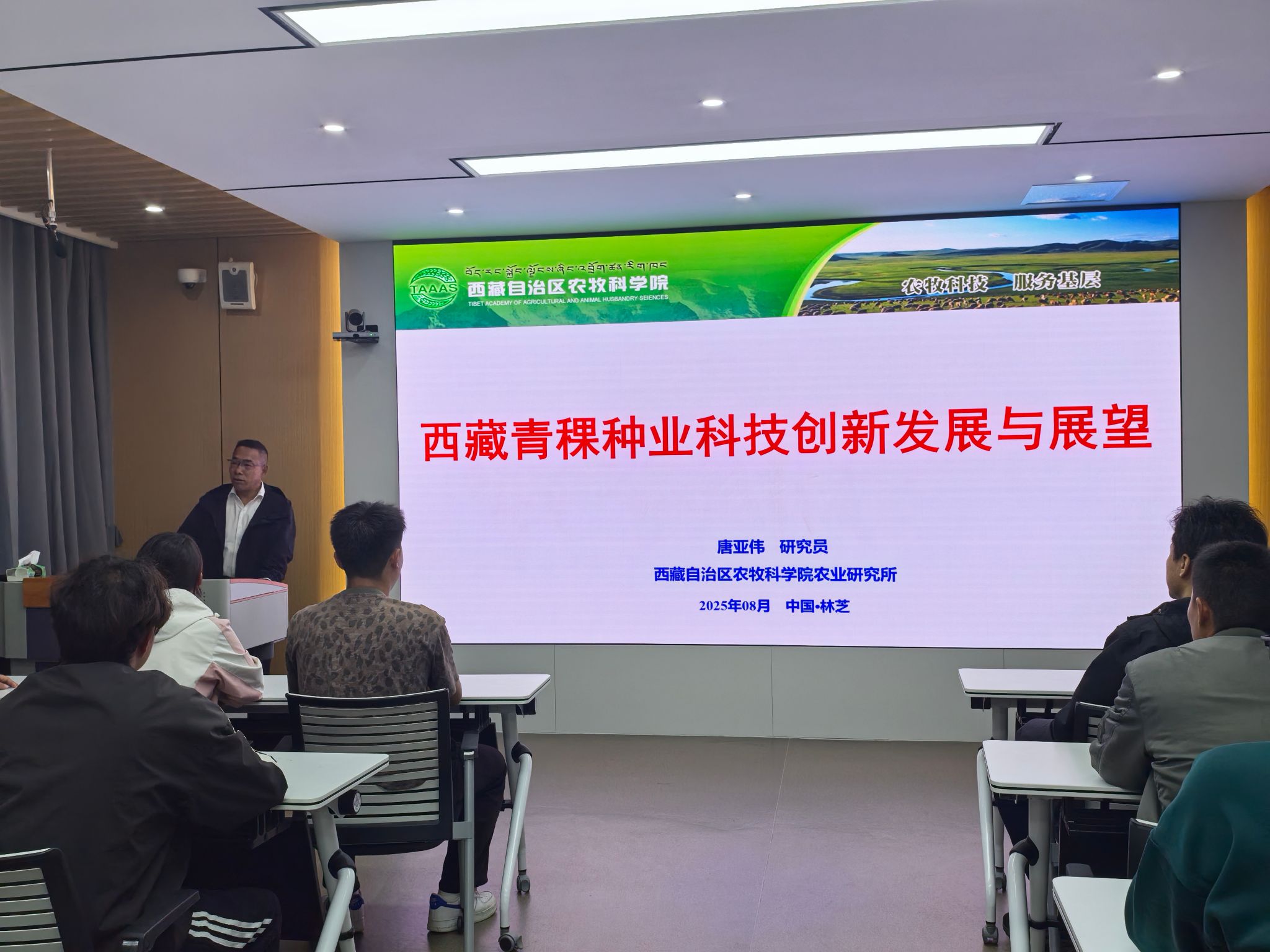 唐亚伟研究员1998年毕业于西藏农牧学院农学系,深耕青稞研究二十余年,主持选育藏青17、藏青3000等16个新品种,推广面积超340万亩,为西藏粮食安全与农牧民增收作出突出贡献。讲座中,他结合PPT数据指出:“青稞占西藏粮食作物播种面积的80%以上,不仅是高原‘粮仓’,更是富含β-葡聚糖、多酚类物质的健康谷物,其营养价值显著高于小麦。”通过对比实验数据,他详细阐释了青稞在抗氧化、降胆固醇等方面的独特优势。唐亚伟系统回顾了西藏青稞育种从引种试种(1950年代)到现代生物技术(2020年代)的五大发展阶段,并重点介绍了团队突破性成果。