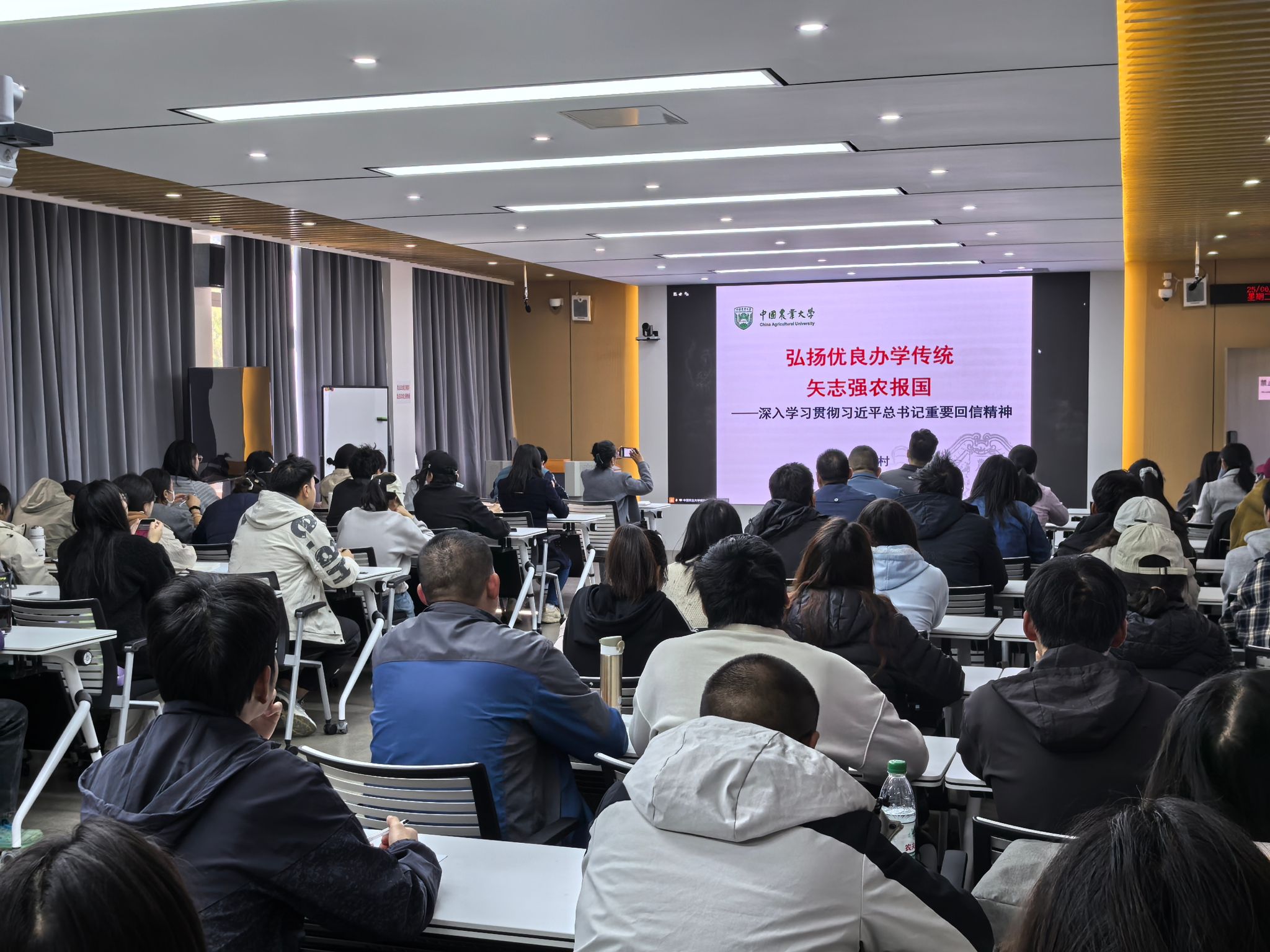 习近平给中国农业大学回信精神,给设农高校发展指明了方向,对于落实教育根本任务、服务国家战略、推动高校改革发展等方面具有重要意义。为深入学习贯彻习近平总书记给中国农业大学回信精神,深刻领会回信的精神实质和丰富内涵,全国植保联盟开展学习活动,由中国农业大学主办,全国44所高校设分会场。植物科学学院党委2025年10月22 日14:00,组织师生党员在2308智慧教室参加分会场学习活动。全体在家学院领导、师生党员60余名参加学习。所管校外科技小院、无课师生在线上直播学习。